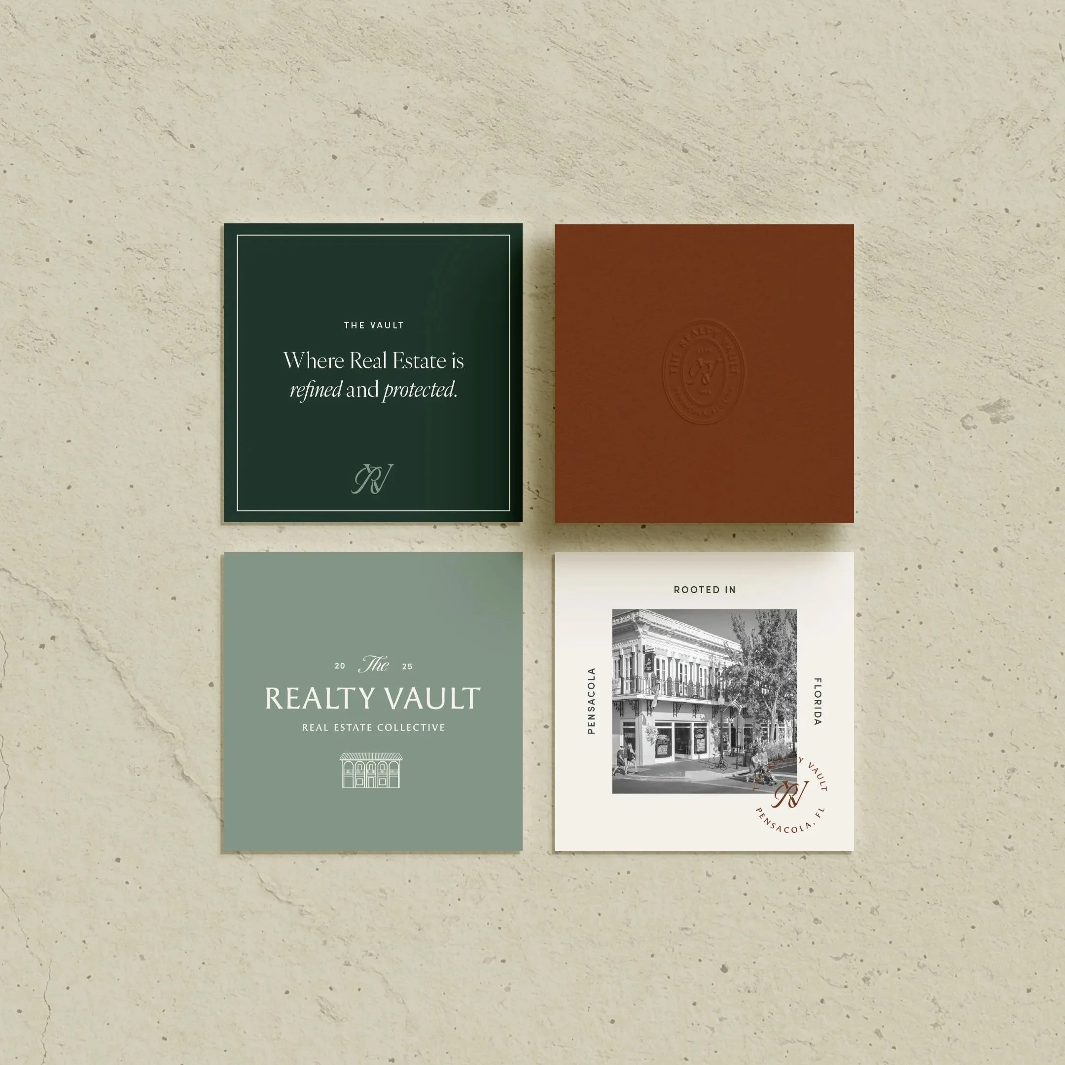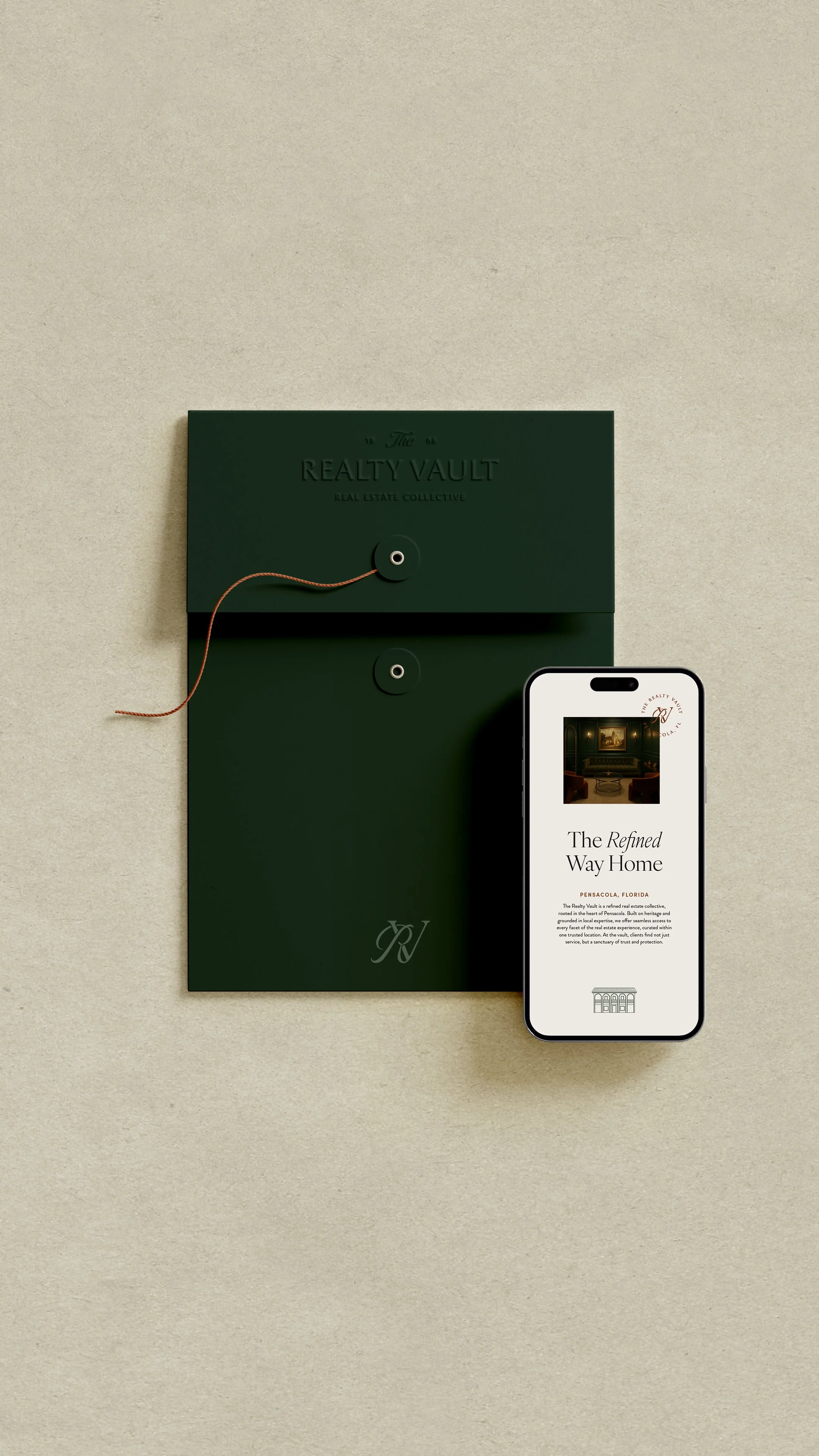 The Realty Vault marked a pivotal transition from a corporate brokerage model to an independent, experience-driven collective. Housed within a historic former bank building, the brand needed to honor its architectural past while positioning itself as a modern, intentional space for agents seeking belonging, flexibility, and distinction. At the heart of this project was the merging of two perspectives— one rooted in traditional office culture, the other drawn to a more modern, fluid approach to real estate. The challenge was to create a brand that felt grounded yet progressive, offering agents a place they wanted to be part of in a time when physical offices are increasingly optional. We approached the identity through a speakeasy-inspired lens, developing a visual system that felt exclusive, layered, and elevated. Custom illustrations of the bank exterior, timeless typography, rich color palettes, and restrained patterns were used to reinforce the concept of The Vault. The brand ultimately evolved into the idea of a Real Estate Collective, a term we brainstormed that came to define both the culture and the vision behind the business.